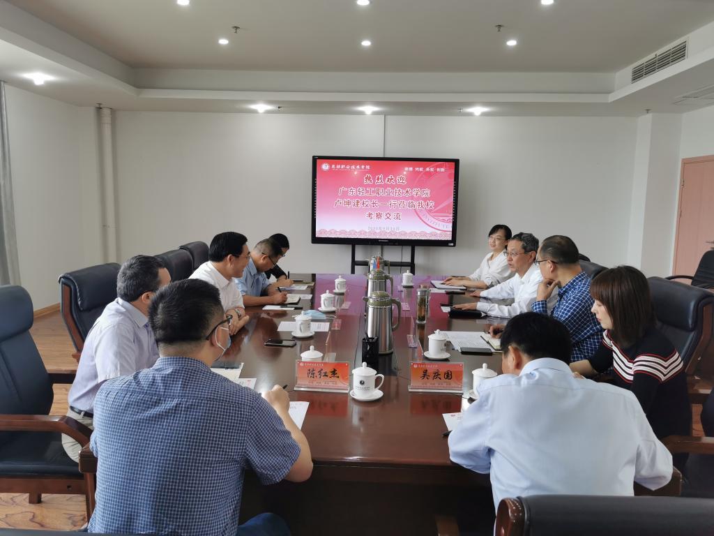 9月24日,广东轻工职业技术学院卢坤建校长一行来我校考察交流,我校党委副书记、校长高武,相关行政部门和二级学院负责人陪同考察。