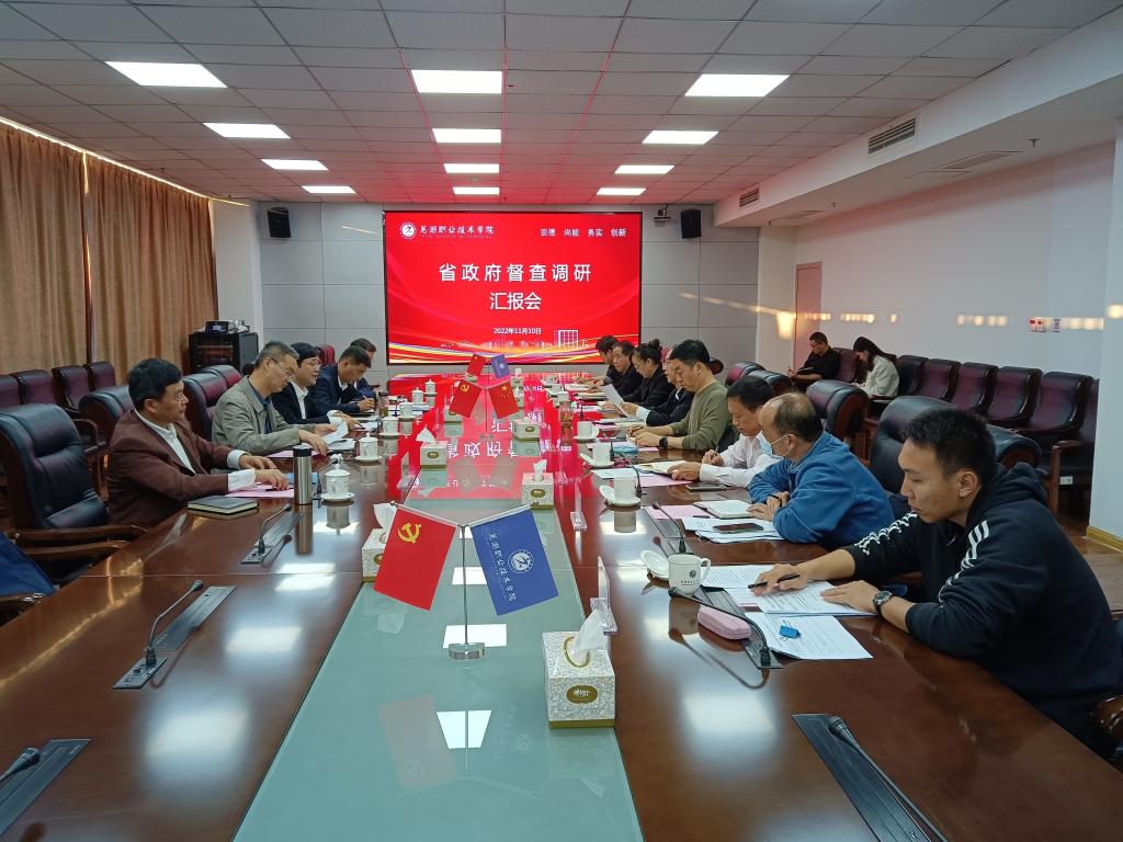 11月10日,省政府督查办公室副主任、正处级督查专员蒋鸿翔,省政府督查办公室副主任门坤峰,省教育厅高等教育处副处长朱永国一行,来我校就《深化高校学科专业机构改革服务产业创新发展实施方案(2022—2025年)》贯彻落实情况开展调研。芜湖市委督查办公室(市政府督查办公室)主任黄汇文、芜湖市教育局副局长周自强陪同。党委副书记、院长高武,党委委员、副院长孙晓雷参加调研。